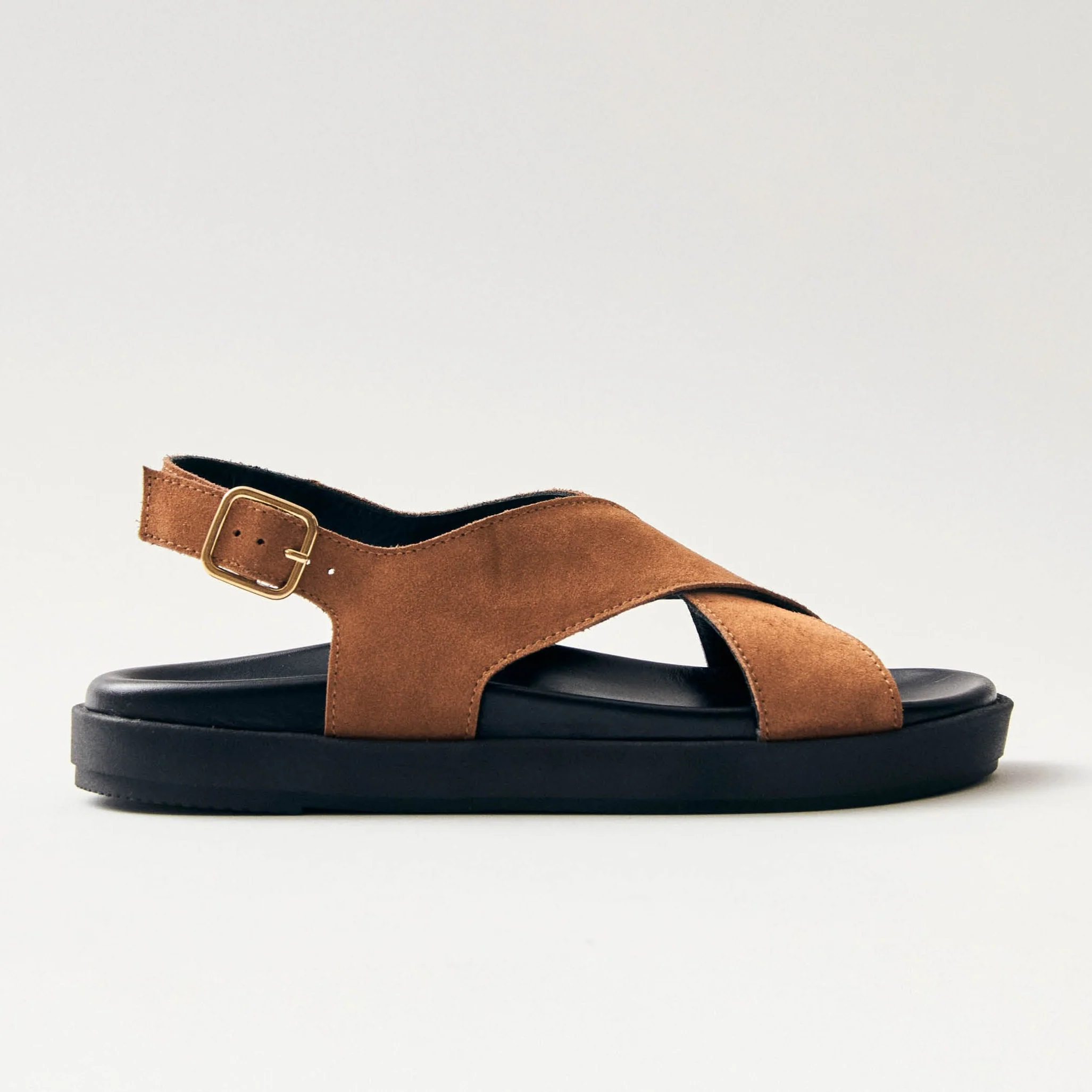 Updating a classic style from our collection, the Nico sandals come with thick crossover straps extending to frame the heel. They are made from brown suede with black leather insoles, molded to offer maximum comfort.